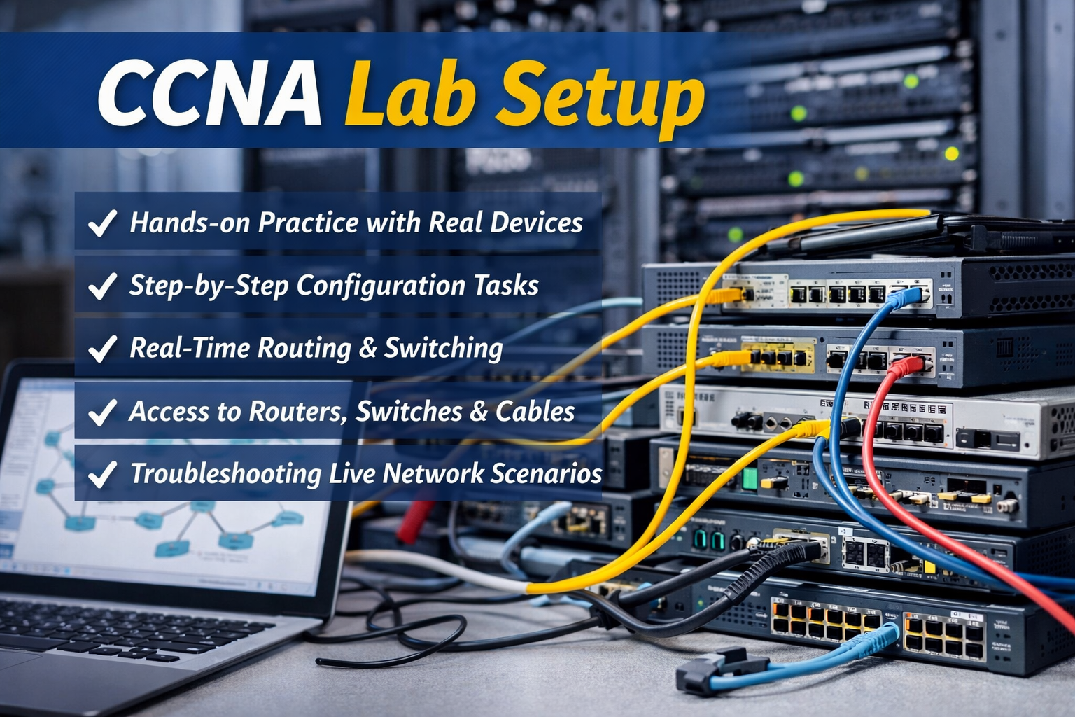 Our CCNA curriculum is designed as per the latest CCNA 200-301 exam blueprint and updated Cisco syllabus. Unlike other institutes, we do not use simulator software in our training. To successfully prepare for the Cisco CCNA 200-301 certification exam, candidates must gain hands-on experience on real devices rather than relying on simulators.